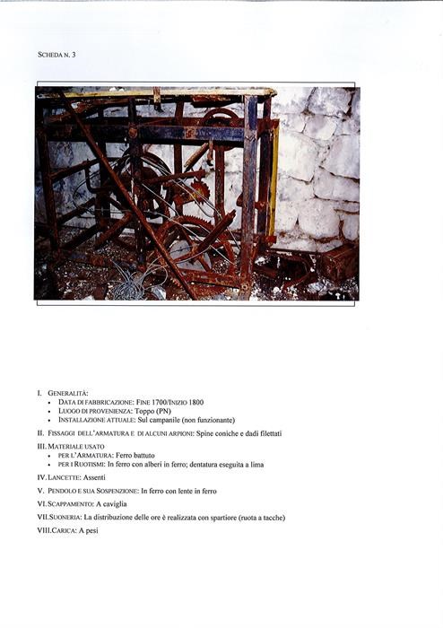 Orologio in ferro battuto, con alberi in ferro, dentatura eseguita a lima, spine coniche e dadi filettati, lancette assenti, pendolo in ferro con lente in ferro, scappamento a caviglia, la distribuzione delle ore è realizzata con spartiore (ruota a tacche), carica a pesi, non funzionante