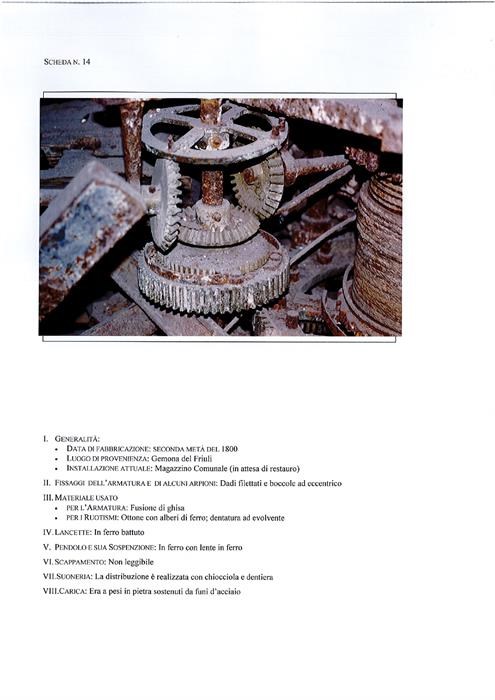 Armatura in fusione di ghisa, ruotismi in ottone con alberi in ferro e dentatura ad evolvente, dadi filettati e boccole ad eccentrico, lancette in ferro battuto, pendolo in ferro con lente in ferro, scappamento non leggibile, la distribuzione delle ore è realizzata con chiocciola e dentiera, la carica era a pesi in pietra sostenuti da funi d'acciaio.